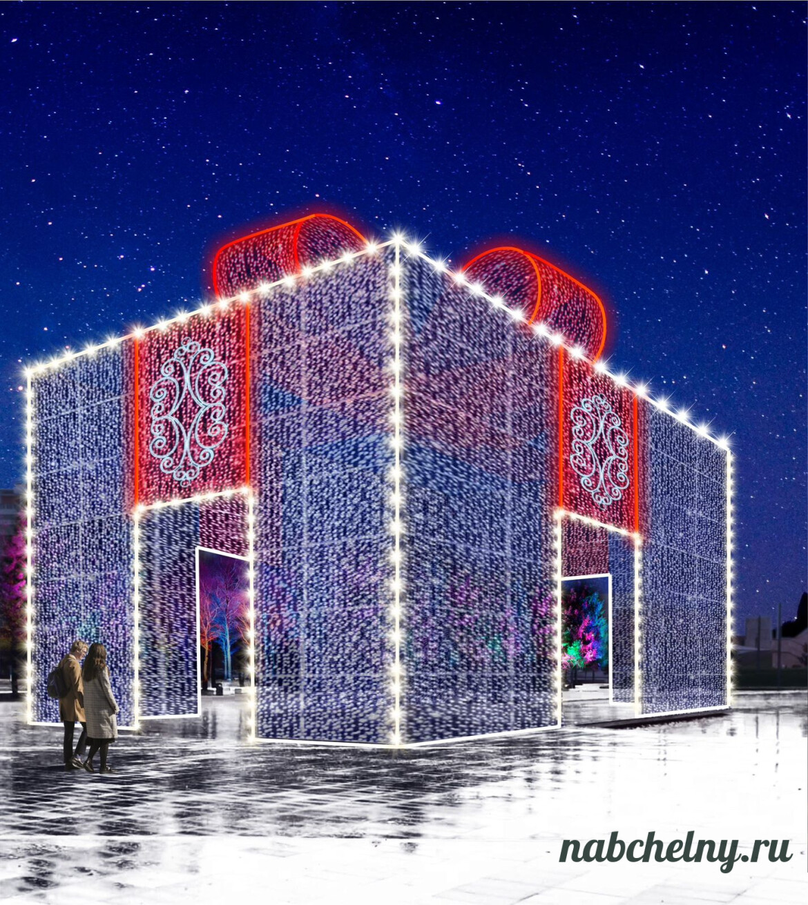 В этом году челнинцев ждут дамы и кавалеры в пышных нарядах, музыкальные инструменты, порхающие балерины, волшебное озеро с Царевной-лягушкой, Су-Анасы, плюшевый медведь с подарками, световые потолки из гирлянд — все это выполнено в увеличенном масштабе, чтобы даже взрослые могли почувствовать себя детьми.
