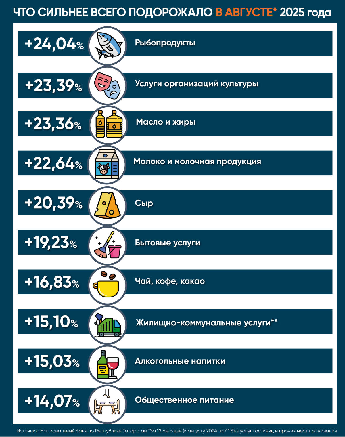 За год сильнее всего в республике подорожали услуги (бытовые, жилищно-коммунальные и организаций культуры) и продукты питания (особенно масло и жиры, а также молочная продукция, в том числе сыр). Цены же на непродовольственные товары (в том числе на моторное топливо, парфюмерию и косметику) в годовом выражении «выросли умеренно».