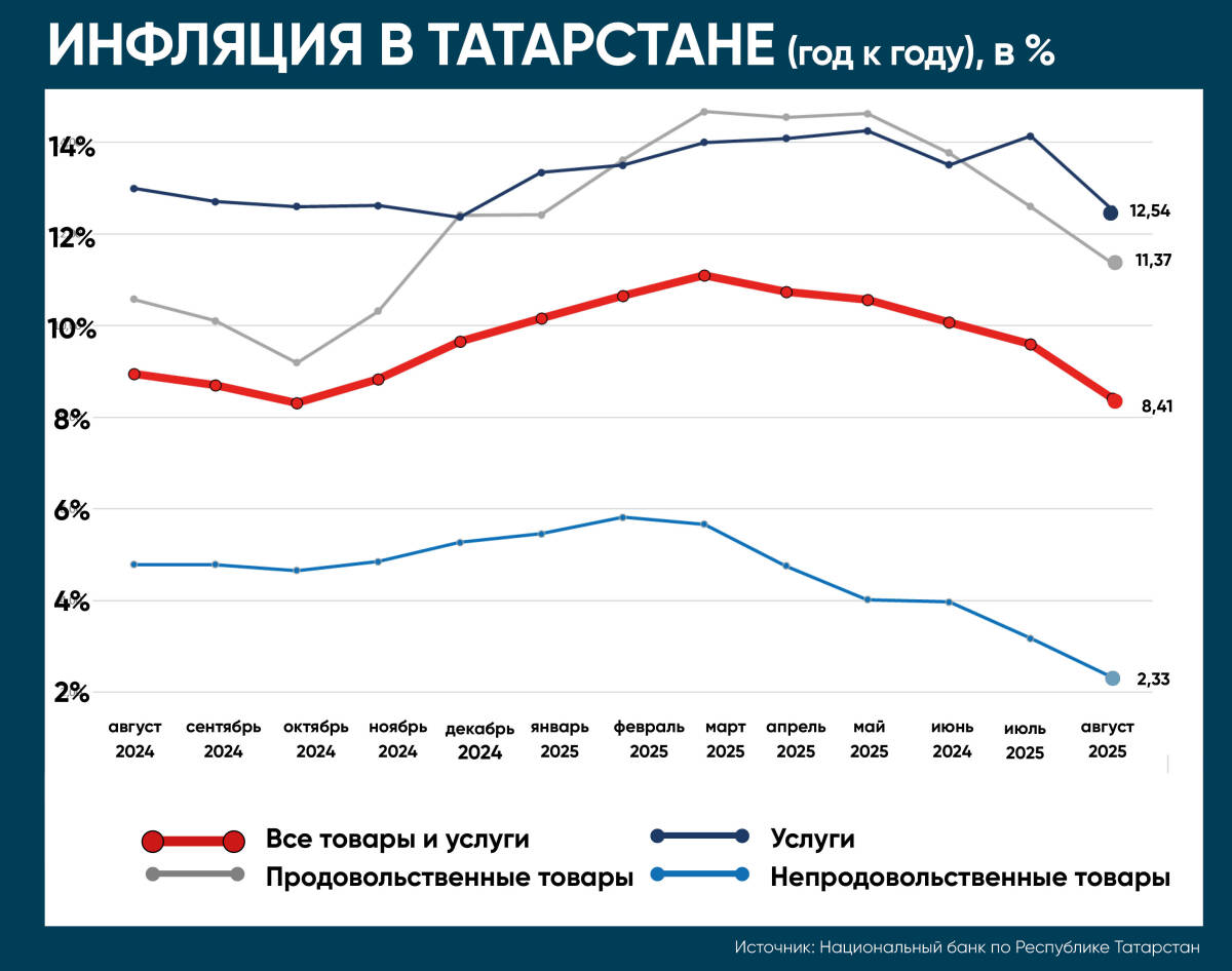 Годовая инфляция в Татарстане, как и в России в целом, продолжает снижаться – в августе до 8,41% после июльских 9,6%. Это по-прежнему выше, чем в целом по стране (8,14%), но уже ниже, чем в ПФО в частности (8,71%). Подробнее – в ежемесячном обзоре «Татар-информа».