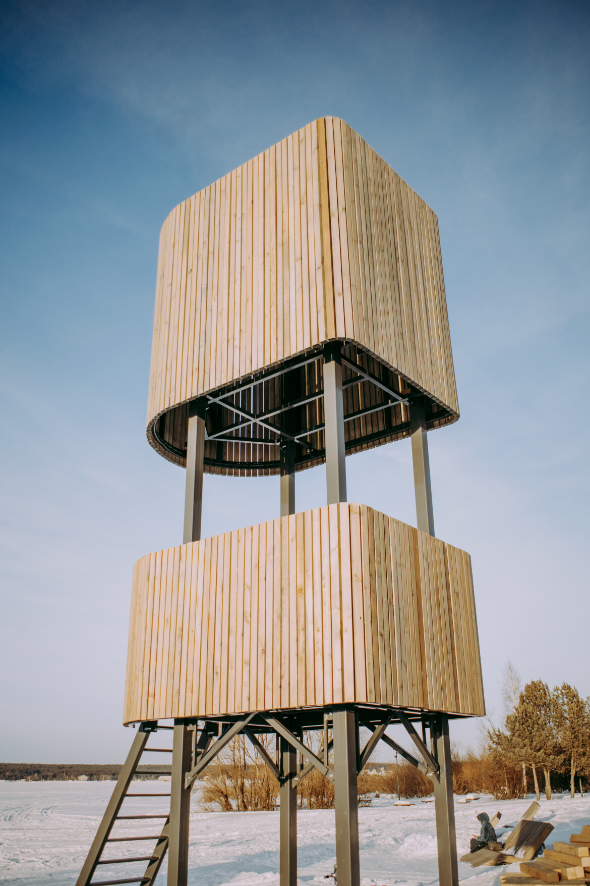 Из интересного, что уже сделано к этому времени: архитектурная изюминка пляжа у яхт-клуба — смотровая вышка, она же маяк. Эта деревянная конструкция уже установлена — она позволит обеспечивать безопасность и присматривать за берегом. А еще за счет своей формы и осветительного прибора будет служить маяком для всех, кто ходит по реке.