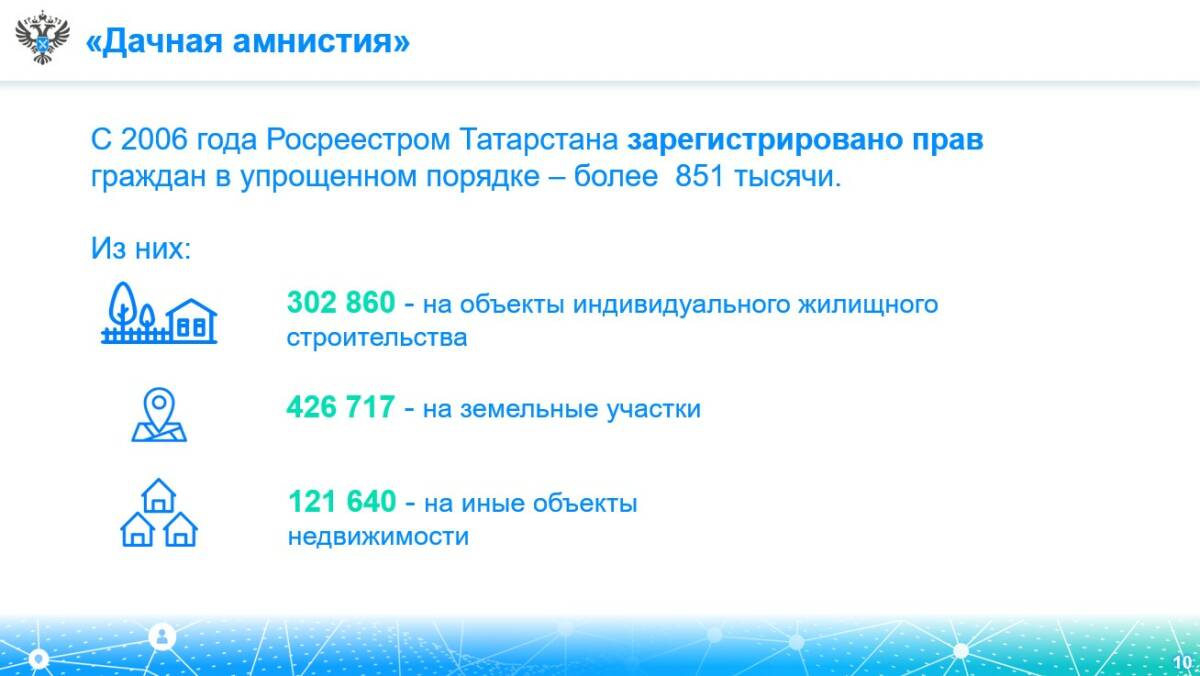 Наряду с гаражной с 2006 года в Татарстане действует дачная амнистия. С момента ее введения по упрощенной процедуре зарегистрировано более 851 тыс. объектов недвижимости. Из них свыше 300 тыс. приходится на индивидуальное жилищное строительство, более 420 тыс. – на земельные участки и более 120 тыс. – на прочие объекты.