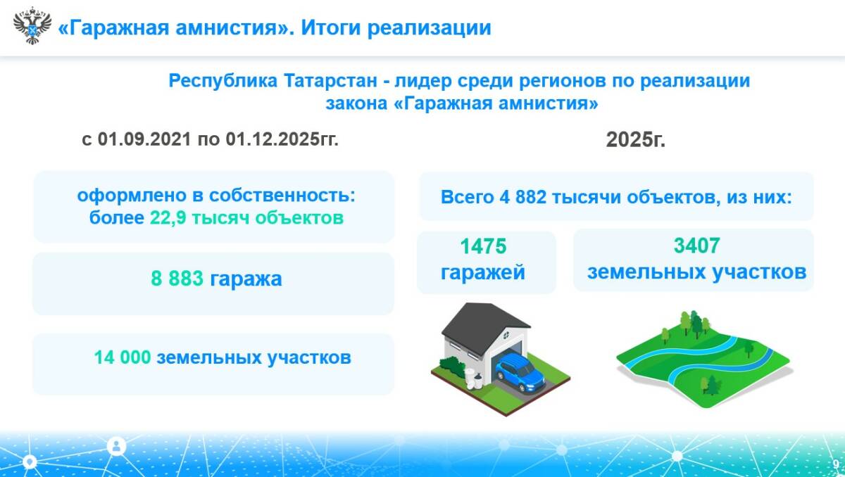 В Татарстане также продолжается работа по упрощенному оформлению собственности на объекты недвижимости и земельные участки. С начала действия гаражной амнистии в республике в собственность оформлено 22,9 тыс. объектов.