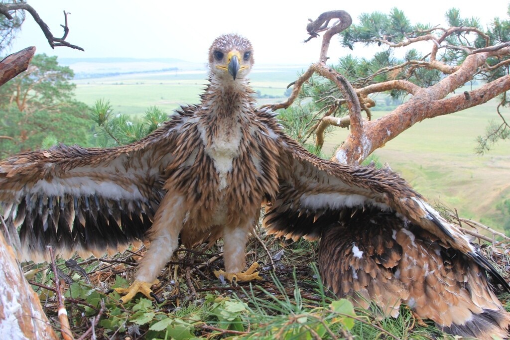 «Всего на кладбищах у нас гнездится около 10 пар. Это из-за того, что кладбища расположены рядом с населенными пунктами и пастбищами, где есть кормовые условия в виде колоний сусликов, а также грачей. Орел рассматривает кладбище как участок с небольшим куском леса, где есть удобное крупное дерево – сосна или тополь и можно построить гнездо», – пояснил орнитолог.