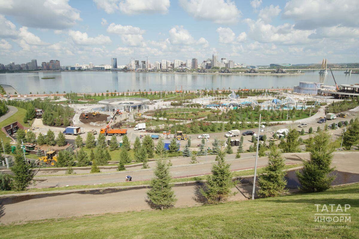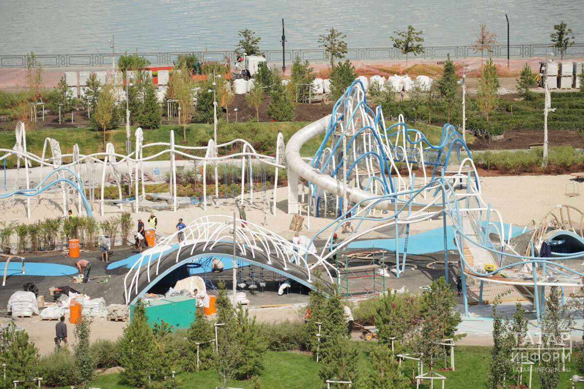 Сейчас рабочие укладывают дорожки, завершают монтаж конструкций в зоне активностей, занимаются озеленением и установкой освещения. Практически готова сцена, на которой уже в День города пройдут первые концерты. С точки съемки не удалось разглядеть обещанных проектировщиками фонтанов и зеленых лабиринтов. И очевидно, что вряд ли к открытию будет готов ресторанный комплекс «Кубэлэк», который вошел в обновленную концепцию парка, представленную в июле. Впрочем, казанцы привыкли к тому, что многие объекты в городе открываются поэтапно.