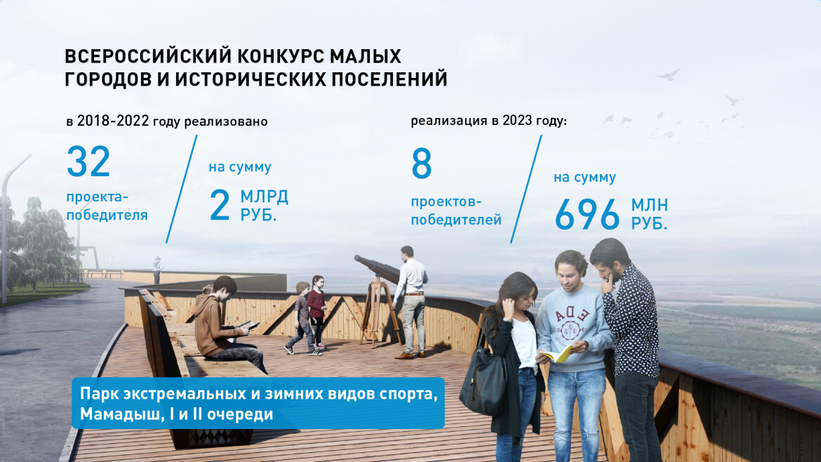 Кроме этого, в рамках конкурса малых городов и исторических поселений за 5 лет реализовано 32 проекта — победители конкурса. Сумма грантов из федерального бюджета превысила 2 млрд рублей. В этом году запланирована реализация восьми объектов-победителей на сумму 696 млн рублей.