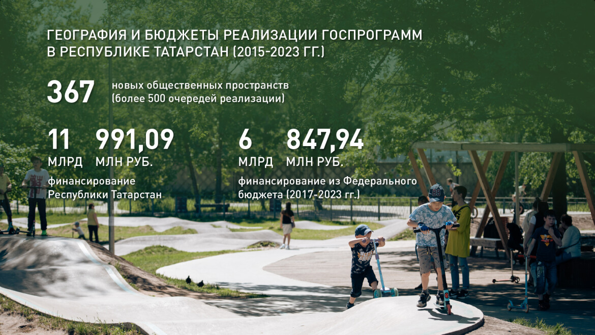 Всего в период с 2015 по 2022 год в республике было обустроено 367 общественных пространств. Общая сумма вложенных средств составила более 18 млрд рублей. На 2023 год запланирована реализация 60 объектов на сумму 2 млрд 281 млн рублей.
