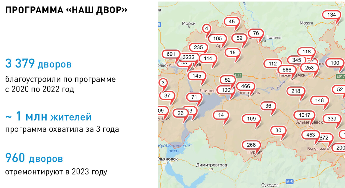 Масштабную программу благоустройства дворов в 2019 году инициировал Раис Татарстана Рустам Минниханов. За время работы программы в республике будет благоустроено около 7 тыс. дворов — это придомовые территории всех многоквартирных домов республики, построенных до 2014 года, где асфальт был в плохом либо удовлетворительном состоянии и ранее не обновлялся по другим программам ремонта дорожных покрытий.