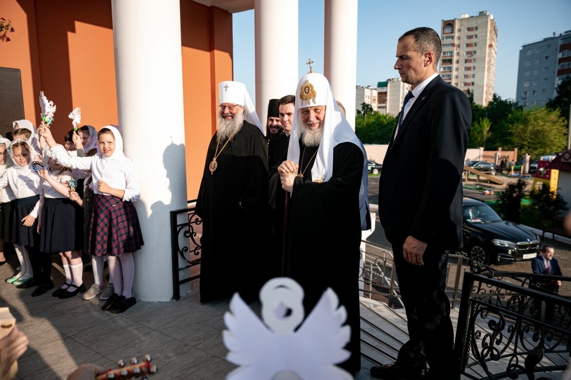 На ступенях храма Патриарха Кирилла встречали секретарь Татарстанской митрополии, настоятель Серафимовского храма иеромонах Кирилл и воспитанники приходской воскресной школы.