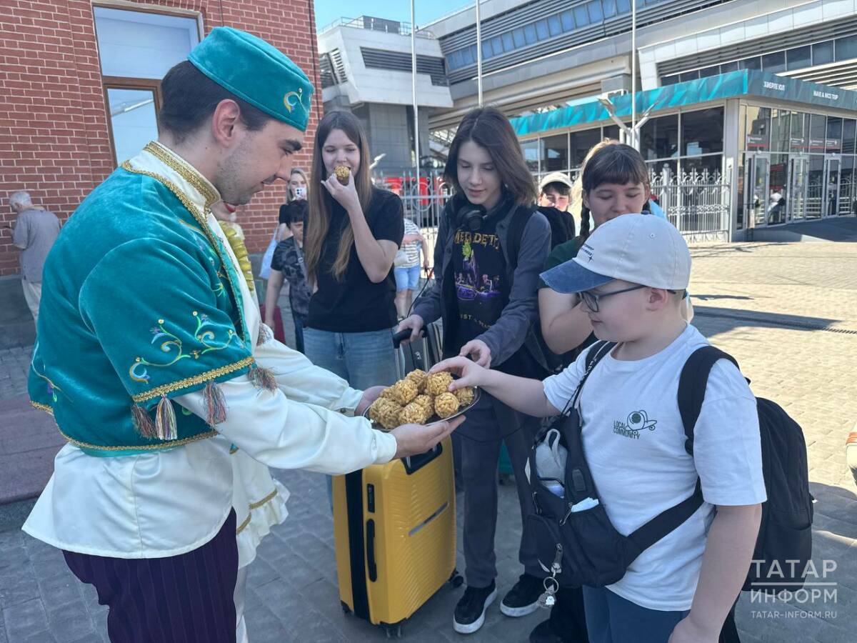 28 мая на Казанский вокзал прибыли участники конкурса «Родники.Дети» из Московской области, Чувашской Республики и Воронежа. Встречали гостей с настоящим татарским гостеприимством: участники шоу-балета «Кристал» поприветствовали участников и угостили детей традиционным чак-чаком.