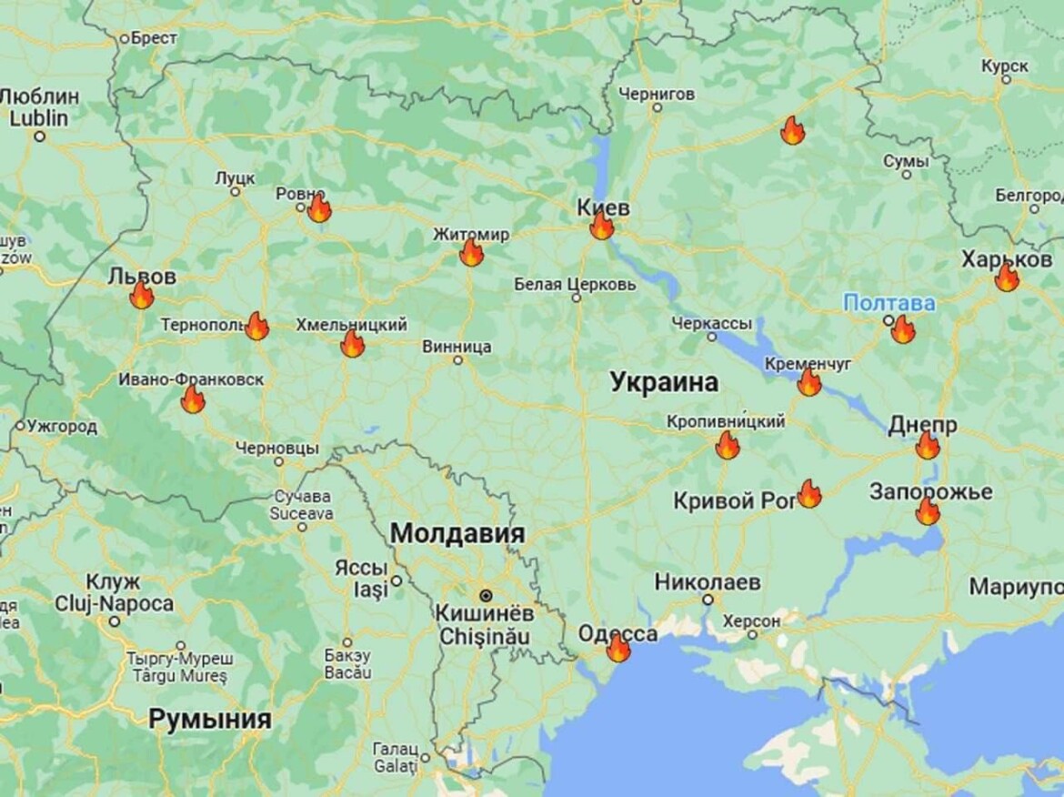 «Отмотаем» обратно к девяти часам утра – на фоне ударов в Киеве местные СМИ начинают сообщать о взрывах в Житомирской области и Днепропетровске. Проходит несколько минут – первые взрывы слышны во Львове и Тернополе, некоторые районы этих городов остаются без света.
