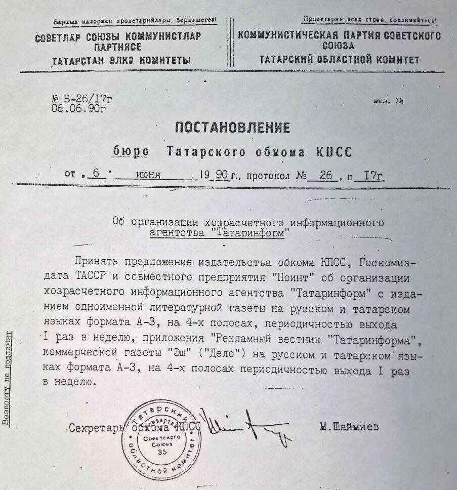 – Да, поэтому одним из учредителей в этом постановлении выступает совместное советско-финское предприятие «Поинт», которое возглавлял мой уже, увы, покойный товарищ Султан Салимзянов, бывший заместитель главного редактора газеты «Вечерняя Казань» (в 1979-1988 гг., – прим. Т-и).