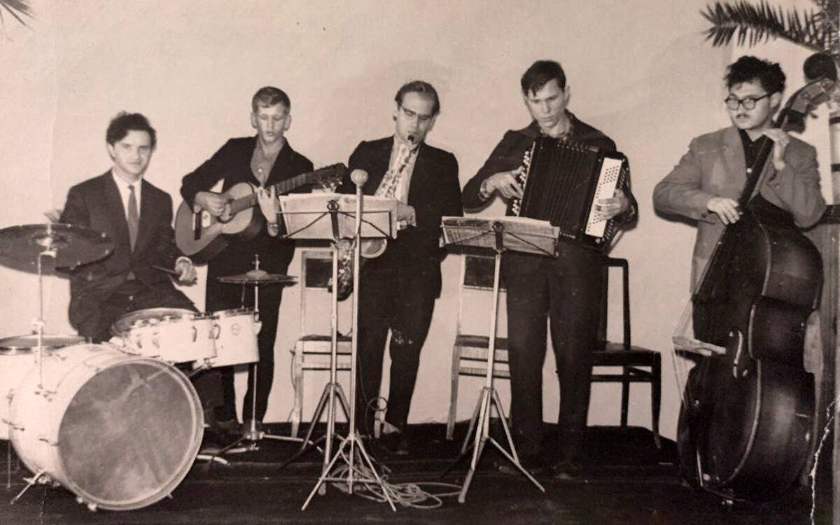 Эстрадно-симфонический оркестр Актюбинского областного дома культуры, на скрипичном контрабасе – У. Богдалов.1960 год
