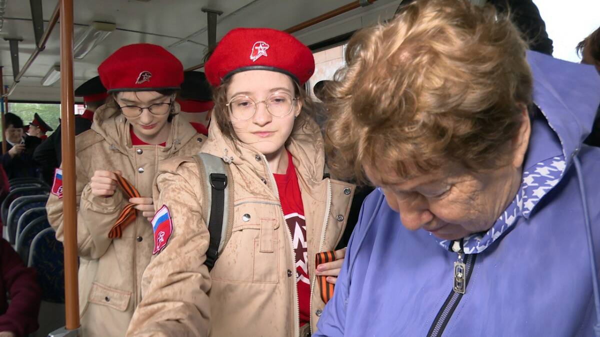 По завершении выступления школьники и кадеты вручили всем пассажирам георгиевские ленточки – символ памяти и благодарности поколению победителей.