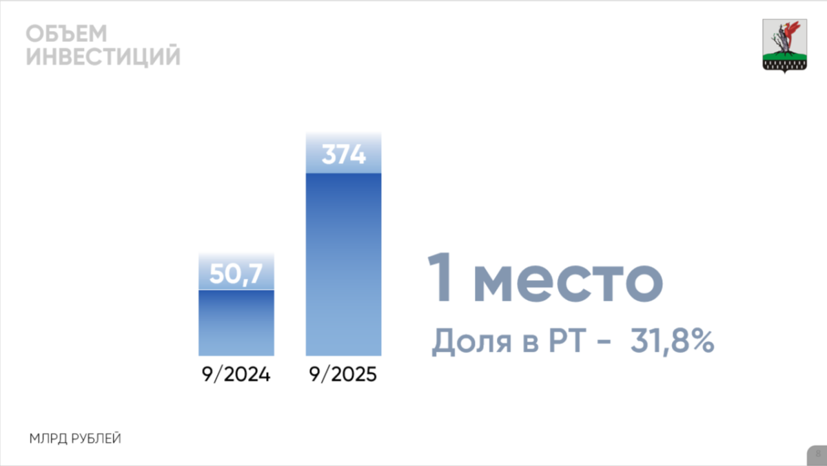 «Первое место в республике мы занимаем по объему инвестиций на одного жителя. За 9 месяцев прошлого года объем инвестиций составил 374 млрд рублей. Это более 30% (31,8 млрд) всех инвестиций республики», – доложил Нуриев.