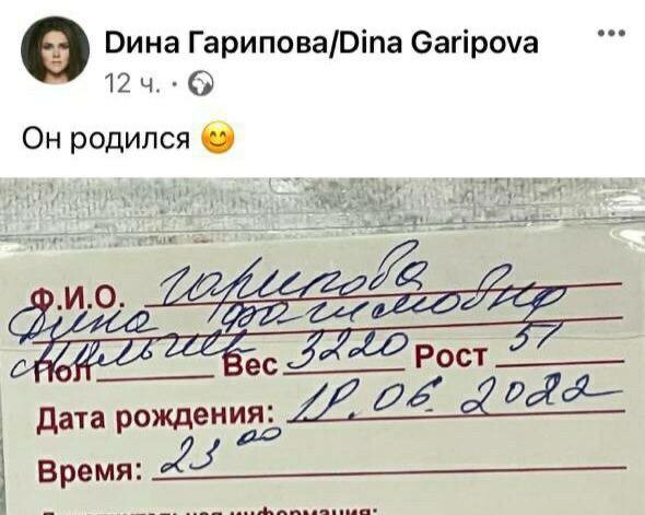 Победительница телешоу «Голос», заслуженная артистка Татарстана Дина Гарипова стала мамой. 19 июня она родила сына весом 3220 граммов и ростом 51 сантиметр, сообщается в официальном телеграм-канале администрации Зеленодольского района.