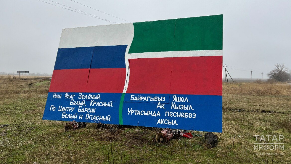«Как-то хотелось обозначить, что здесь именно татары живут. Мы живем. Мы нарисовали татарский флаг – самый большой, заметьте, флаг Республики Татарстан в Херсонской области. Наш девиз: "Наш флаг – зеленый, белый, красный. По центру Барсик, белый и опасный". Мы периодически приезжаем, подкрашиваем где надо, где надо – подчищаем, – рассказывает Бурый. – Сзади, когда смотришь, ничего не видать, ничего непонятно. А тут мы просто взяли на татарском написали. Мы специально его сюда принесли. Видите, вон там указатель дорожных направлений, куда сколько километров осталось. Мы ее просто спилили и поставили сюда, подкрасили. Маленький уголок Республики Татарстан», – рассказал боец.