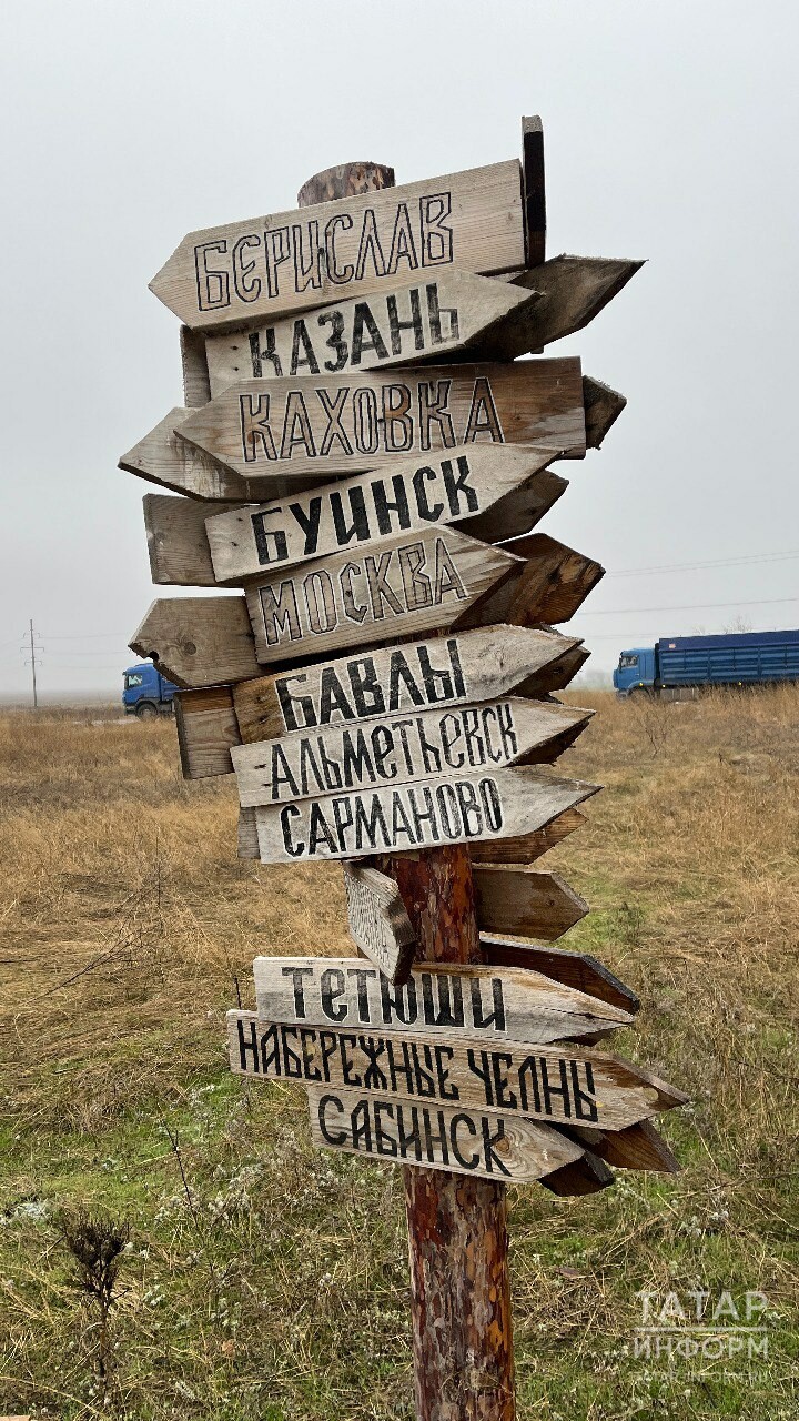 На деревянном указателе военнослужащие указали все города Татарстана: Казань, Альметьевск, Лениногорск, Нурлат, Мамадыш и т.д.
