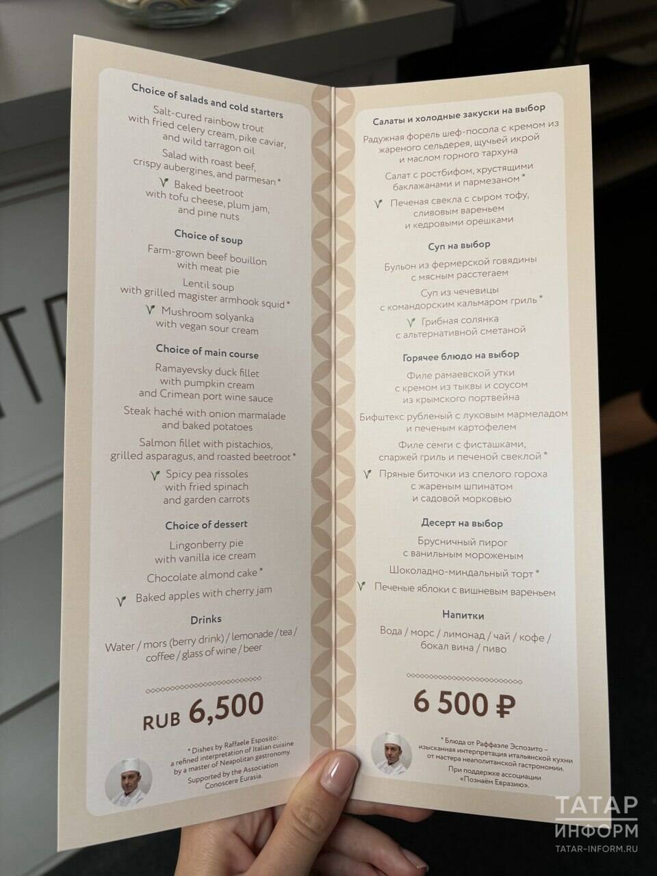Чем кормят на ПМЭФ? Комплексный обед за 6500 рублей подают в местном ресторане. Говорят, в прошлом году он стоил 4900 рублей. Блюда даются на выбор, в том числе вегетарианские. Например, биточки из спелого гороха, грибная солянка с альтернативной сметаной и печеные яблоки.