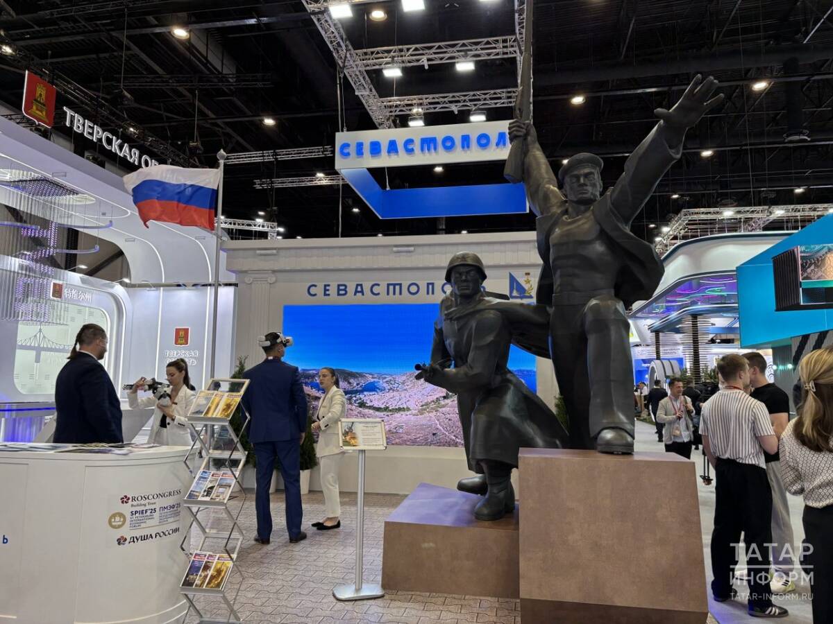 На стенде Севастополя можно увидеть скульптуру «Солдат и матрос», посвященную освободителям города от войск нацистской Германии в 1944 году.