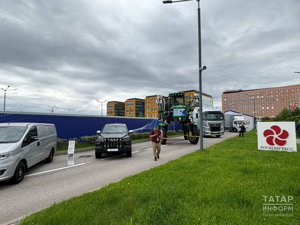 Перед «Экспофорумом» слева направо – коммерческие автомобили Sollers Atlant, которые производятся на ОЭЗ «Алабуга»; полноприводный самоходный опрыскиватель «Казаньсельмаш», тягач «КАМАЗ» с полуприцепом, грузовик на газу «ЛОТОС Юниор» от «Раритэка».