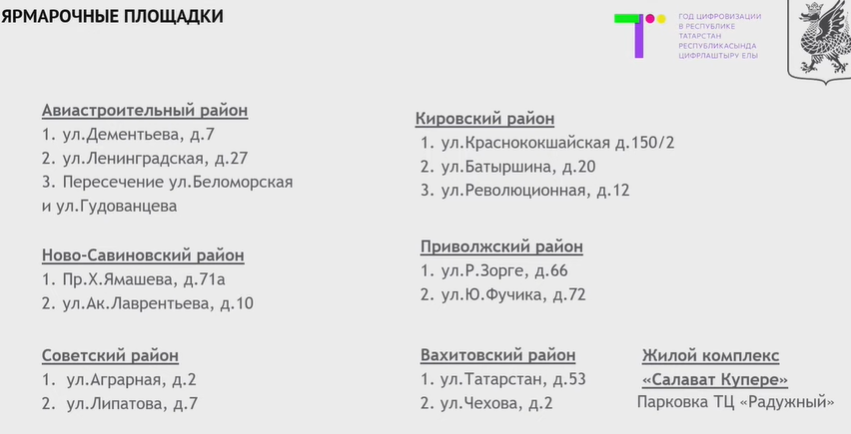 Площадки с товарами организуют на пересечении улиц Беломорской и Гудованцева, ул. Дементьева, 7, ул. Ленинградской, 27, пересечении улиц К. Тинчурина и Татарстан, ул. Чехова, 2, ул. Краснококшайской, 150/2, ул. Революционной, 12, ул. Батыршина, 20, на проспекте Ямашева, 71а, ул. Академика Лаврентьева, 10, ул. Р. Зорге, 66, ул. Ю. Фучика, 72, ул. Липатова, 7, в агропромышленном парке «Казань» (ул. Аграрная, 2). Жители «Салават Купере» смогут посетить ярмарку на парковке перед торговым центром «Радужный».