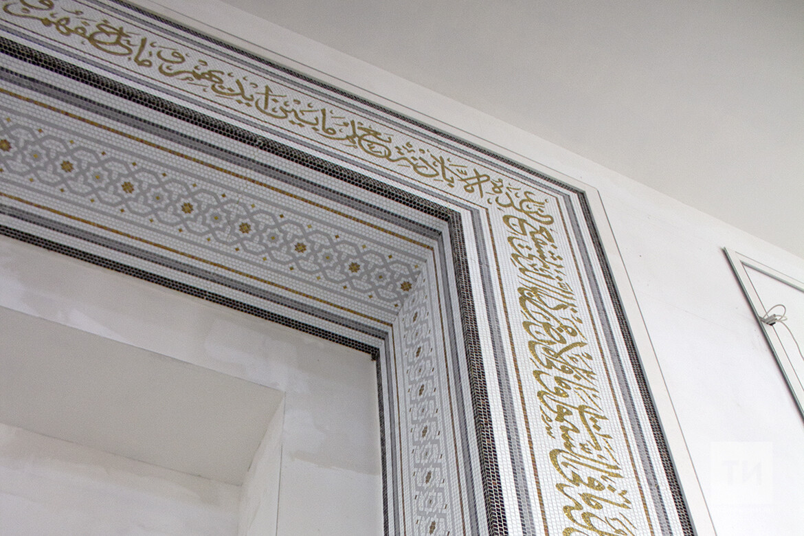 Над главным и женским входами мозаикой выложены слова свидетельства «Ля Иляха Илляллах, Мухаммаду-Расулюллах»