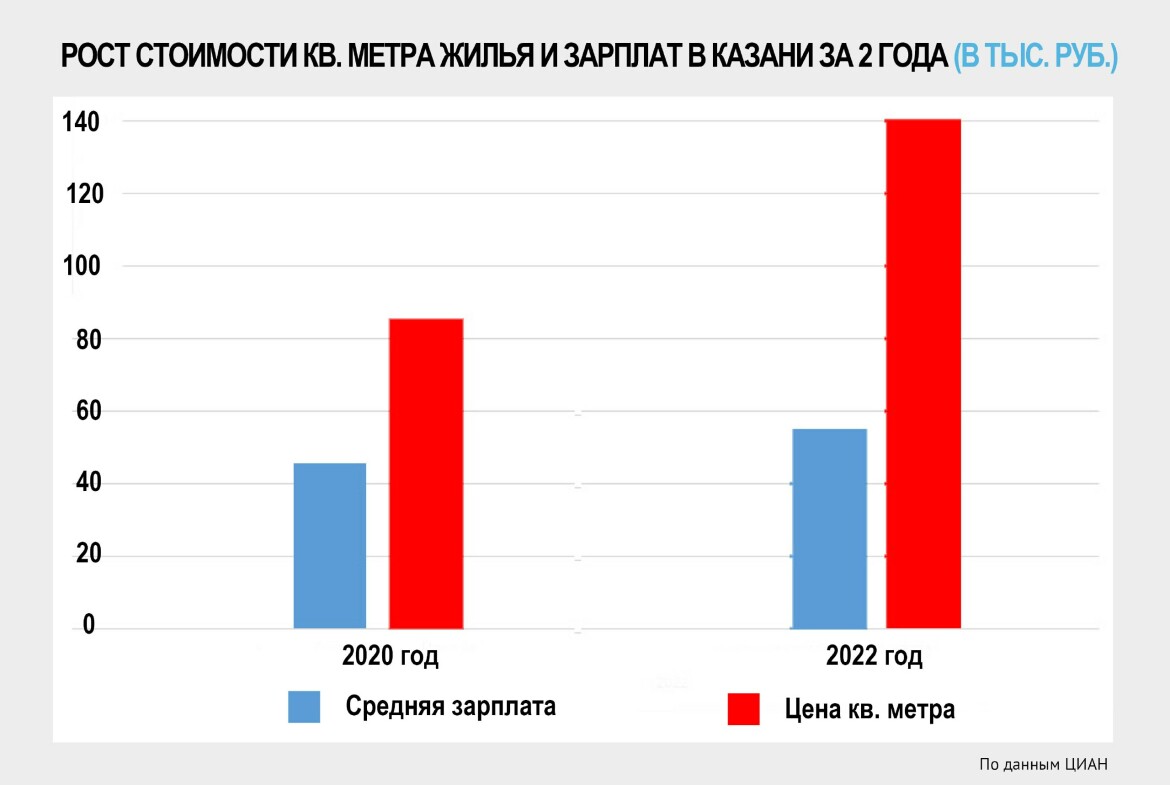 А теперь более подробно рассмотрим, как изменилась доступность жилья для казанцев. Если брать усредненные данные «ЦИАН», в 2020 году житель Казани зарабатывал 45,6 тыс. рублей, а «однушка» площадью 40 кв. м стоила 3,4 млн рублей.
