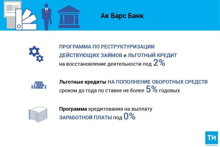 Повышенным спросом у предпринимателей пользовались программы по реструктуризации действующих займов и льготный кредит на восстановление деятельности под 2%. Ак Барс Банк реструктуризовал кредиты на 6 млрд рублей. По программе кредитования на восстановление деятельности под 2% годовых одобрено заявок на сумму 1,3 млрд рублей.