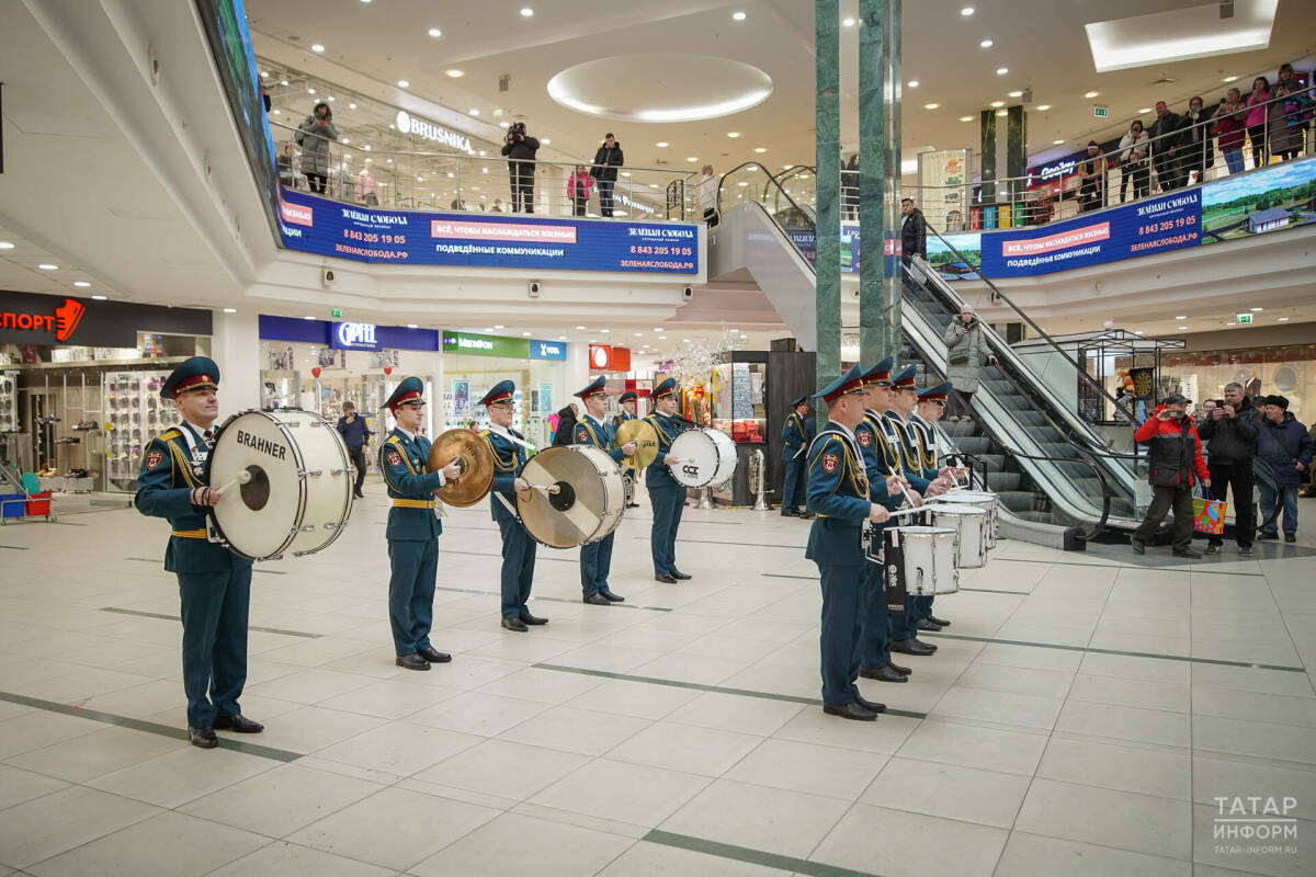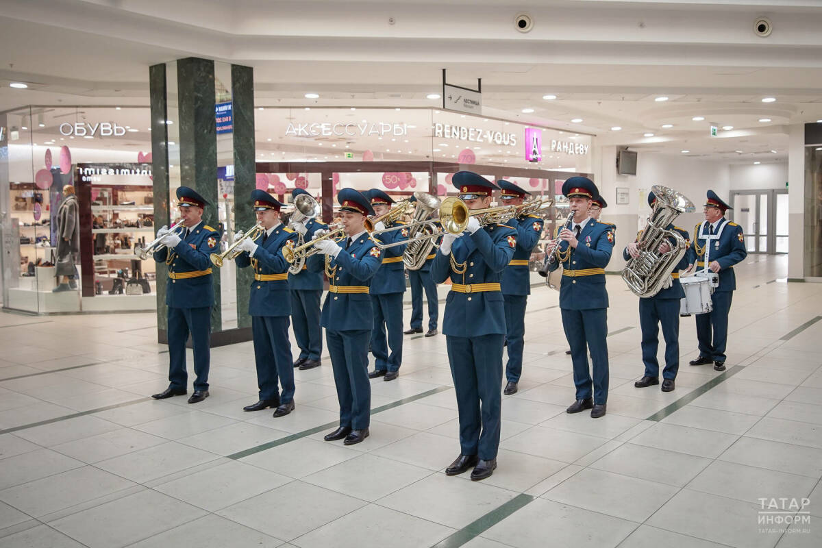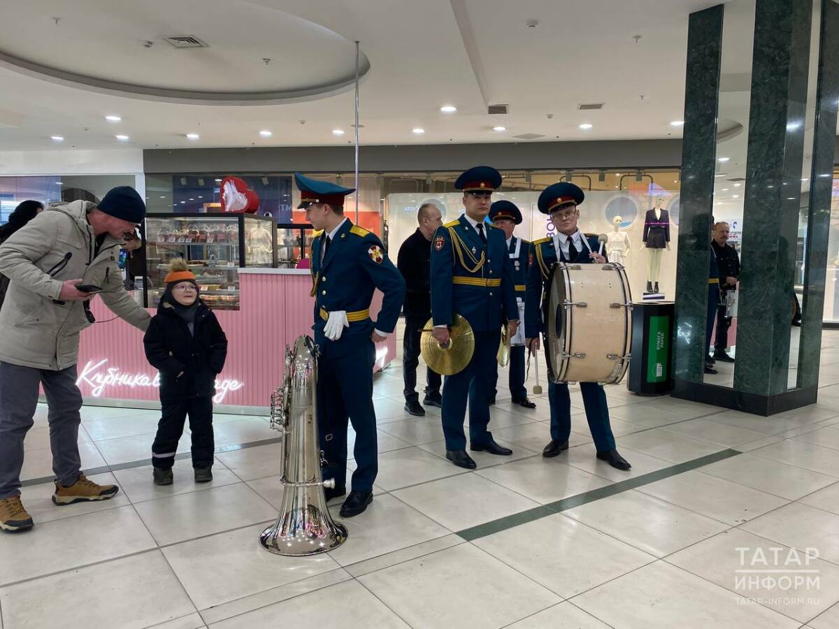Сегодня в казанском торговом центре «Тандем» состоялся яркий флешмоб, организованный военным оркестром Росгвардии. Музыканты порадовали посетителей живым выступлением, посвященным Дню защитника Отечества.