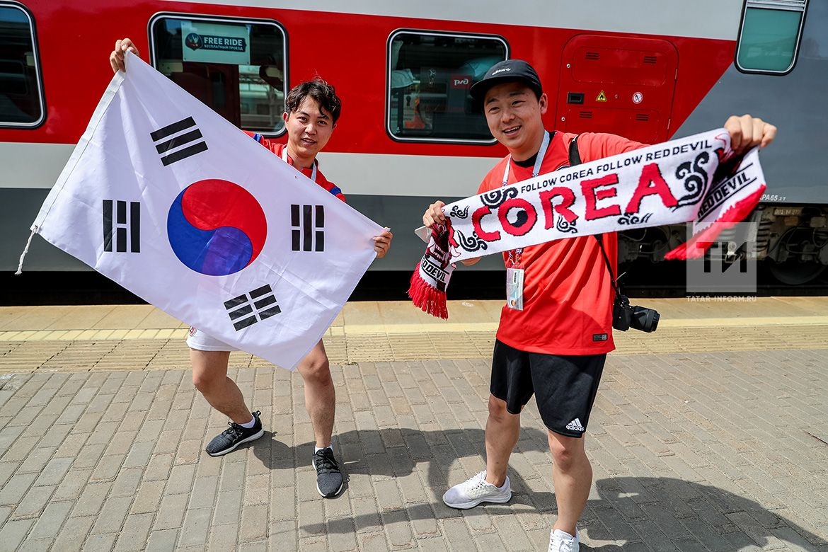 (Казань, 27 июня, «Татар-информ», Сергей Гаврилов). За 6 часов и 15 минут до начала матча чемпионата мира по футболу Германия — Южная Корея на «Казань Арене» на ж/д вокзал Казань-1 прибыл поезд с поклонниками двух сборных. Вряд ли они ожидали такой теплой встречи уже на вокзале.