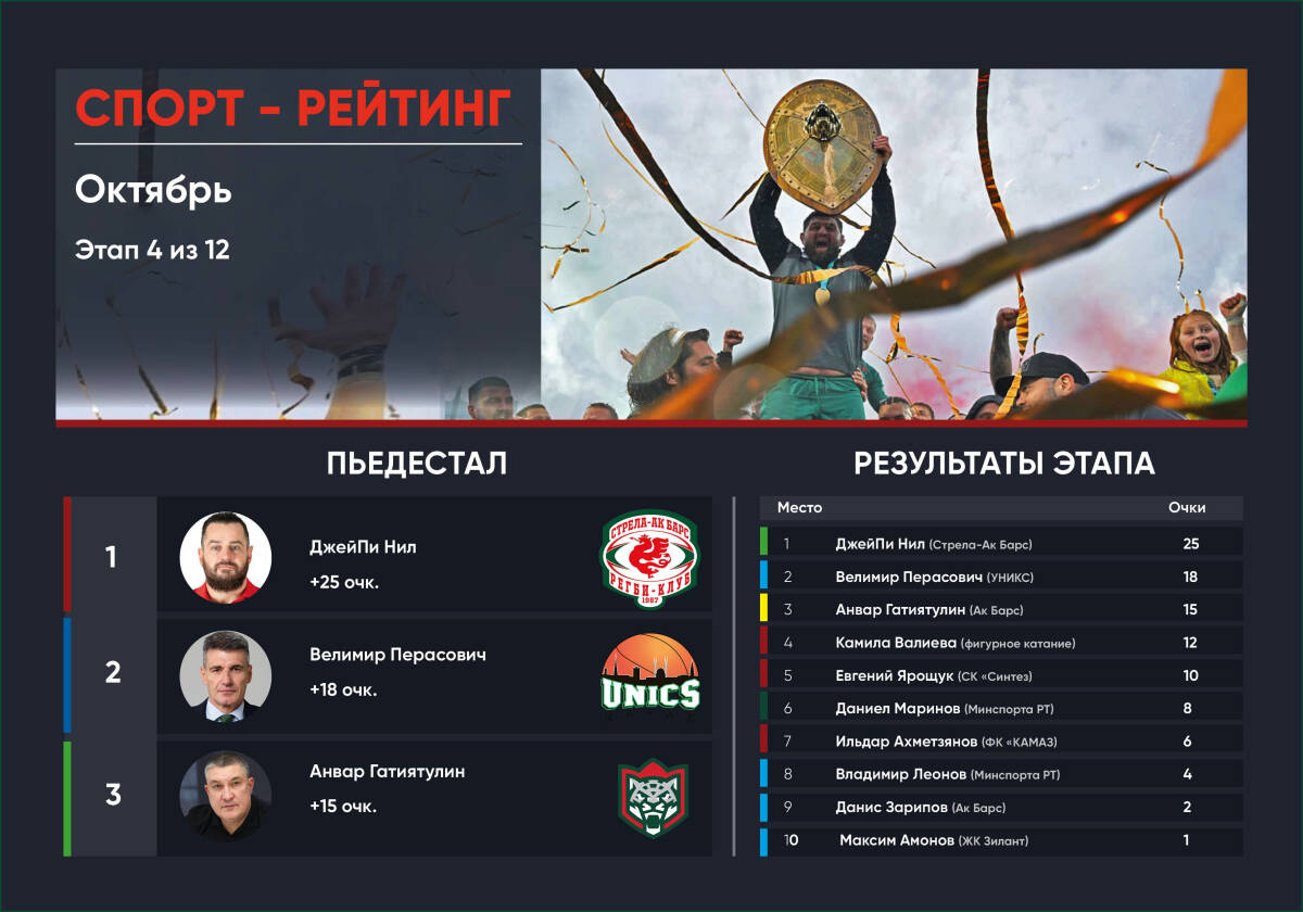 На четвертом этапе Спортивного рейтинга Татарстана по версии «ТИ-Спорта» тройку сильнейших в личном зачете составили ДжейПи Нил, Велимир Перасович и Анвар Гатиятулин. «Рубин» пока удерживает лидерство в общем зачете, но футболистов догоняют «Ак Барс» и УНИКС.
