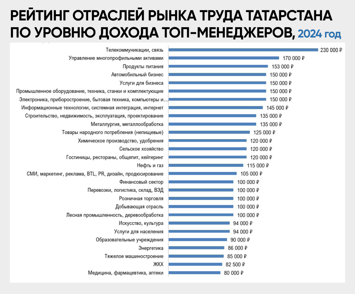 Для топ-менеджеров наиболее выгодные предложения этой осенью предлагают татарстанские работодатели из сферы телекома (в среднем 230 тыс. рублей в месяц). На втором месте рейтинга находится сфера управления многопрофильными активами (170 тыс. рублей), на третьем – продуктов питания (153 тыс. рублей), далее идут автобизнес, услуги для бизнеса, промышленное оборудование, электроника и приборостроение (по 150 тыс. рублей).