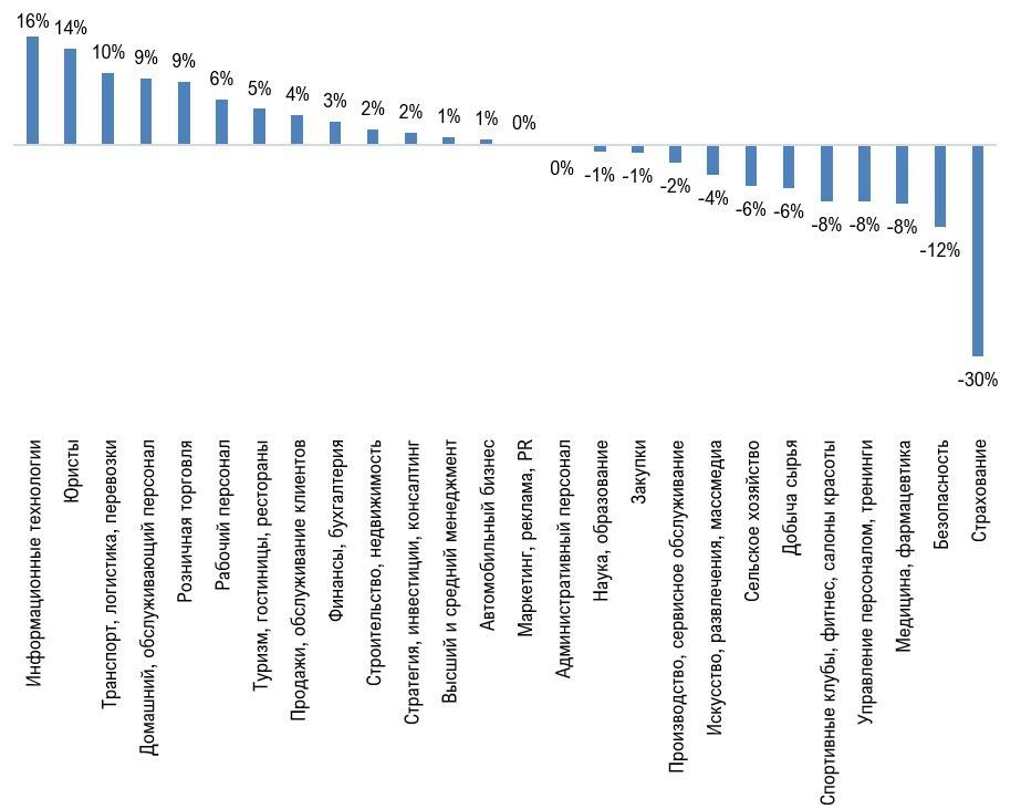 По данным hh.ru, острый дефицит кадров в самых массовых сферах – розничной торговле, ремонте и продажах авто, медицине, транспорте, строительстве, на производстве. На старте делового сезона отмечается сезонный подъем спроса на специалистов в IT (на 16%), юристов (14%), в сфере логистики (10%), обслуживающий персонал и в ритейле (по 9%).