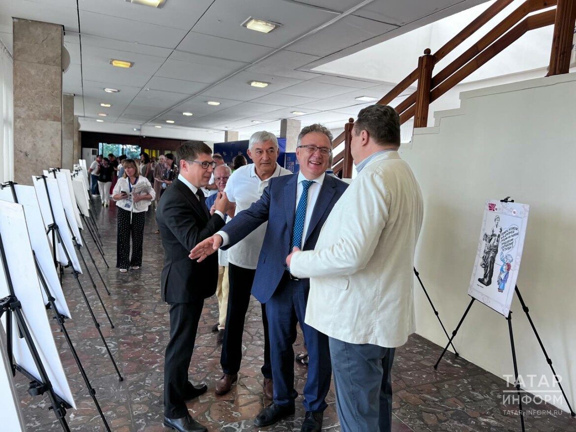 «Казань показывает свою работу журналистской элите России. Это дорогого стоит. Смотрите, смейтесь», — напутствовал он пришедших. Для желающих он сам провел экскурсию по экспозиции и рассказал о работах.