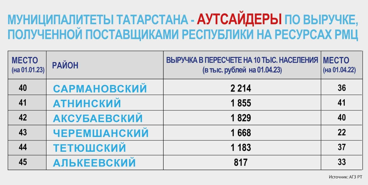 АГЗ РТ ведет учет и в разбивке по 45 муниципальным образованиям республики: 43 районам и двум крупнейшим городам – Казани и Набережным Челнам. Причем ежемесячное ранжирование в АГЗ РТ делают, переводя абсолютные показатели в относительные, путем пересчета объемов выручки на 10 тыс. населения. Такой подход позволяет более объективно сравнивать несопоставимое – ту же Казань со всеми остальными 44 муниципалитетами республики.