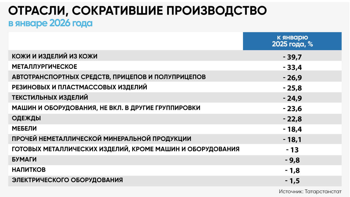 А в отраслях, ориентированных на ВПК, случились обычные для этих волатильных категорий «качели». Например, выпуск компьютеров и периферии скакнул на 13,5%, а машин и оборудования, не включенных в другие группировки, обвалился на 23,6%. Впрочем, динамика в машиностроении в Татарстане давно зависит от отрасли, статистику по которой Татарстанстат в сводках не показывает, – речь про прочие транспортные средства и оборудование (включает авиа- и судостроение, а также БПЛА). Напомним, из материалов Минпромторга РТ к итоговой коллегии ведомства, которая прошла в феврале, можно было узнать, что объемы производства в этой категории обработки за 2025 год выросли на 340%, а отгрузка – почти в три раза. Вряд ли в январе там что-то изменилось радикально.
