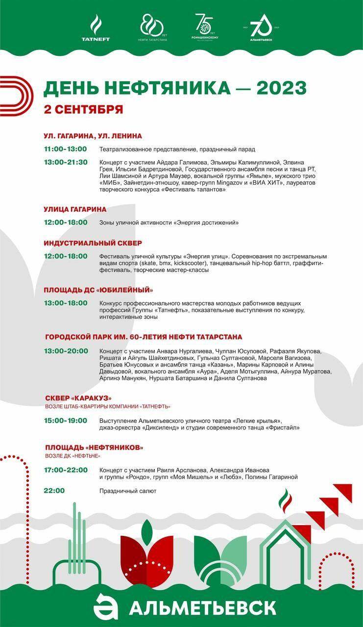 2 сентября в Альметьевске пройдут праздничные мероприятия, приуроченные ко Дню нефтяника. О том, какие события пройдут на разных площадках города, рассказали в пресс-службе района.