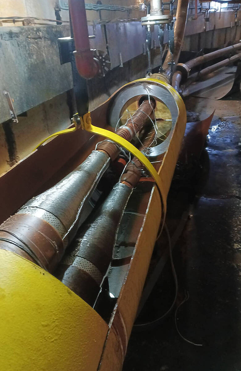 Особое внимание уделили экологии. Ведь в каждой из четырех «старых» кабельных систем залито свыше 20 кубометров изоляционного масла, то есть в общей сложности предстоит извлечь еще почти 60 кубометров. Для исключения протечек масла пришлось разработать особую схему по выемке кабелей из стальной трубы. Однако первый «подход к снаряду» успехом не увенчался. Поначалу кабель планировали вынимать из трубы по одной фазе, и сразу всей строительной длины, а это порядка 700 метров! Но крепление троса лебедки к кабелю сорвалось. Специалистам «Гидроэлектромонтажа» пришлось придумать новый способ крепления.