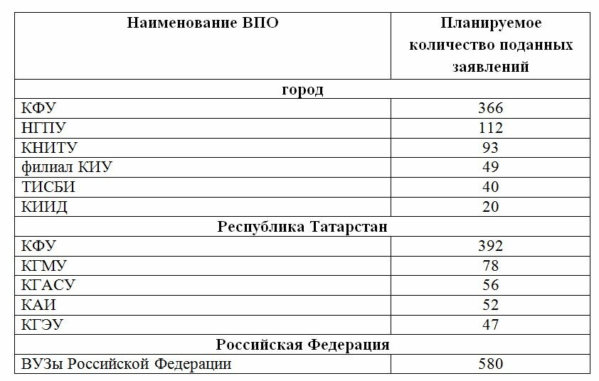 В частности, 625 абитуриентов выбрали республиканские учебные заведения, 580 — вузы России. Среди популярных вузов Казани — КФУ, КГМУ, КГАСУ, КАИ и КГЭУ.
