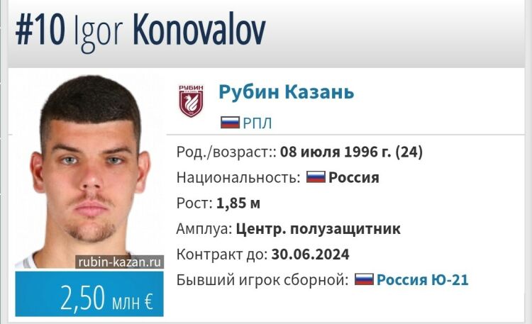 Новое соглашение 24-летнего футболиста с казанским клубом рассчитано до конца июня 2024 года. Прежнее соглашение игрока с клубом действовало до конца прошлого сезона. В нем Коновалов сыграл 29 матчей за «Рубин» в РПЛ, забил 1 гол и отдал 1 голевую передачу.