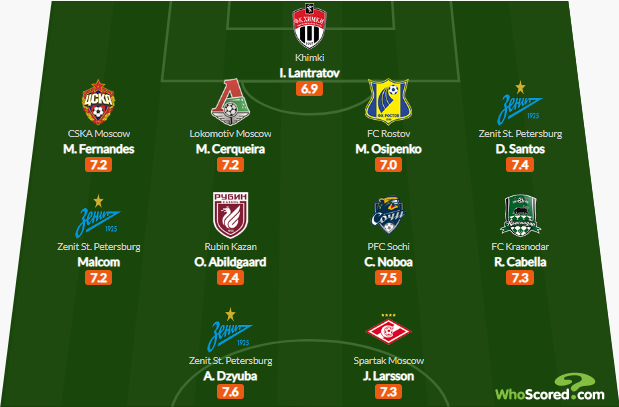 Также в символическую сборную РПЛ включены 4 игрока с российским гражданством: голкипер «Химок» Илья Лантратов, защитники Марио Фернандес (ЦСКА) и Максим Осипенко («Ростов»), а также нападающий «Зенита» Артем Дзюба.