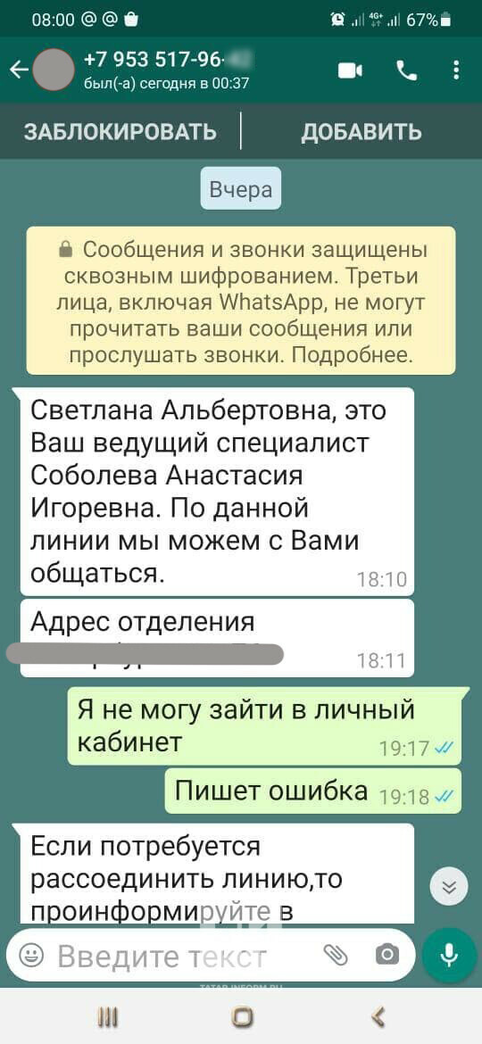 Затем ей снова позвонил тот же мужской голос и стал невнятно объяснять, что, возможно, утечка данных произошла через другой банк, стал спрашивать данные ее родственников, на что Светлана ответила, что предоставит всю информацию, но только уже в отделении полиции. Трубку тут же положили. С аватарки номера в мессенджере был удален фирменный знак банка, Светлана получила последнее сообщение с текстом «простите», а затем номер стал недоступен.