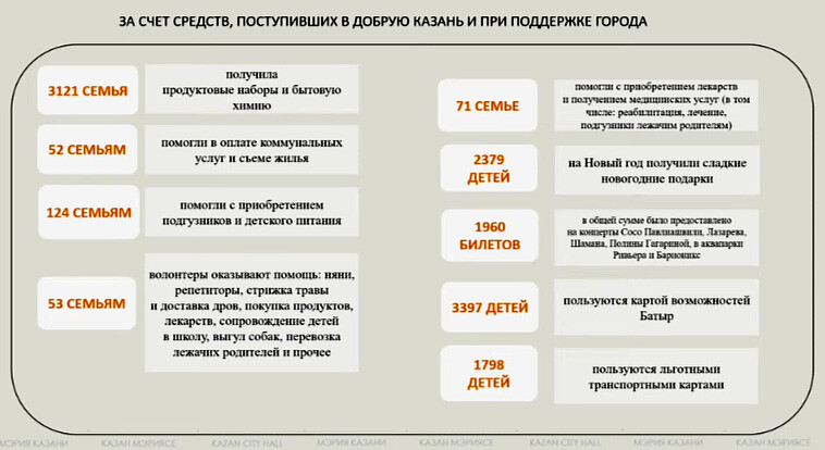 На сегодняшний день свыше 3,1 тыс. семей мобилизованных казанцев получили продуктовые наборы и бытовую химию, 52 семьям помогли в оплате коммунальных услуг и съеме жилья, 71 семье помогли с приобретением лекарств и медицинских услуг. Свыше 3,3 тыс. детей пользуются картами «Батыр», свыше 1,7 тыс. — льготными транспортными картами. Также семьи бойцов СВО смогли посетить концерты Полины Гагариной, Сергея Лазарева, Шамана и других. На эти цели было выделено почти 2 тыс. билетов в общей сложности.