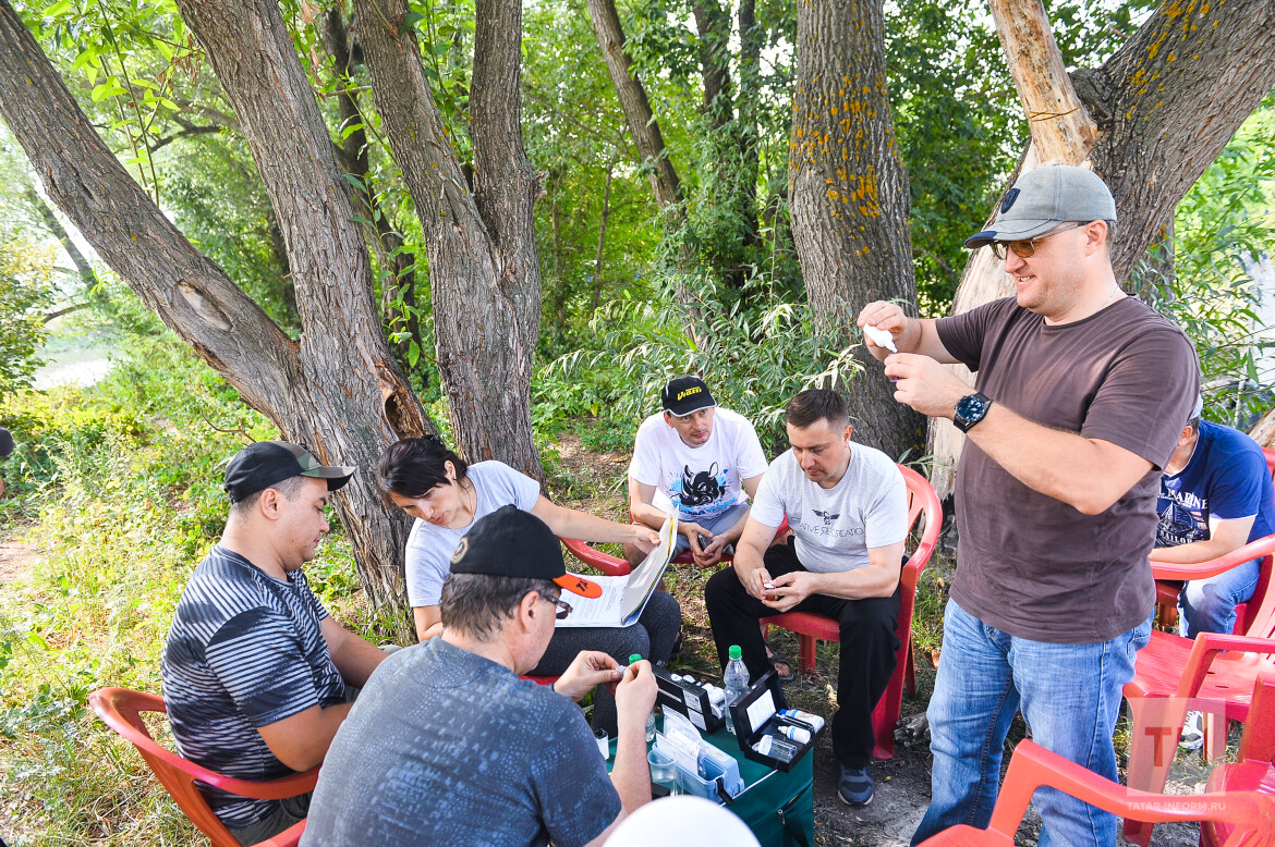 Возле деревни Тайсуганово — начальной точки маршрута, членов команд ожидали три зеленых ящика. После обязательного инструктажа участникам показали содержимое чемоданов. В них находились посуда, оборудование и реагенты для определения качества воды в реке. Все манипуляции участникам предстояло провести самостоятельно под присмотром специалистов Центра по приему-сдаче нефти Компании.