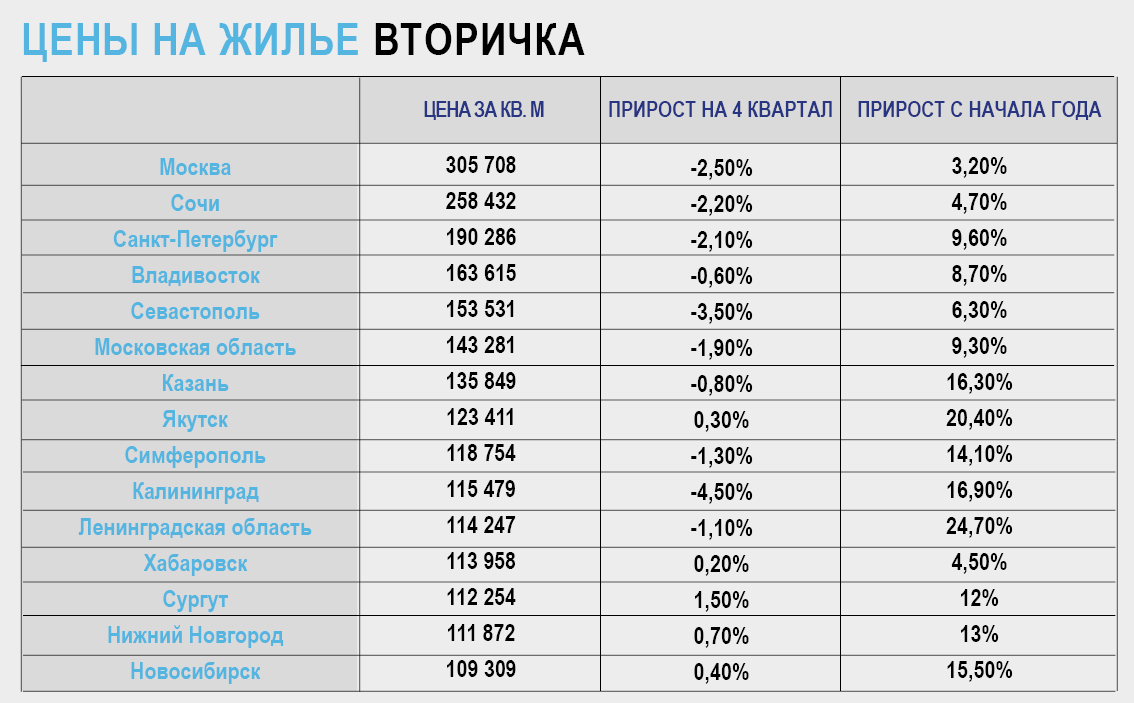 Такая же ситуация наблюдается и в других крупных городах. В Москве, в Сочи и в Санкт-Петербурге – в городах, где спрос на жилье всегда был высоким, – цены на вторичку снизились более чем на 2%. При этом и годовая динамика в столице была минимальной – всего 3,2%. Фактически цены на готовые квартиры в Москве стагнировали.