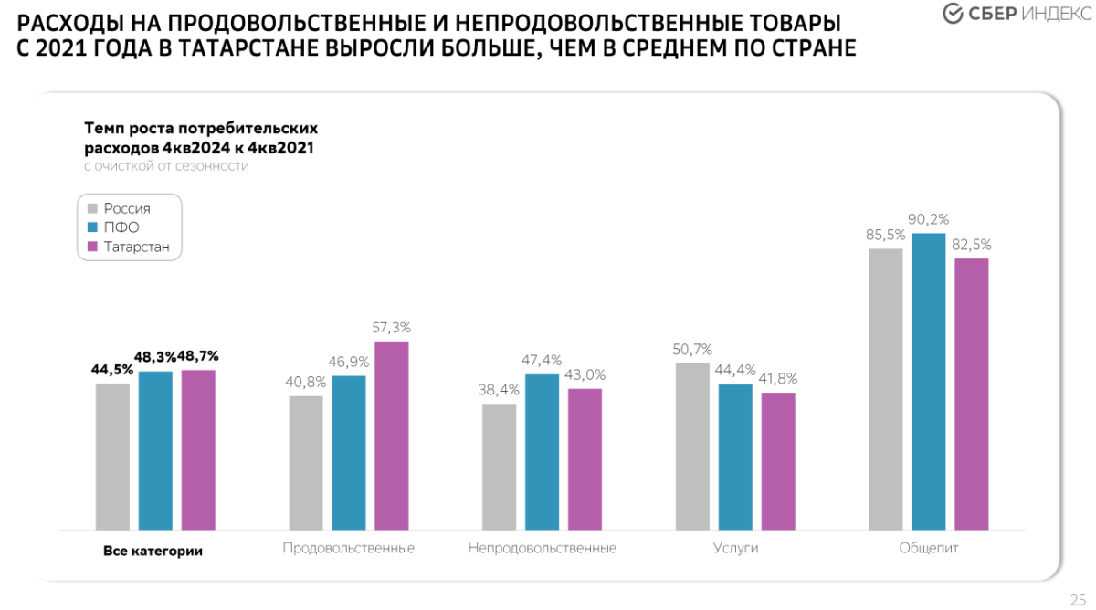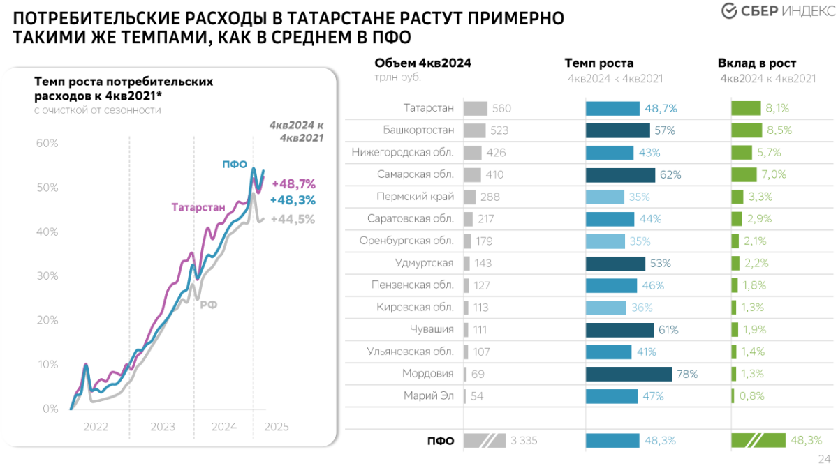 Темпы роста потребительских расходов в Татарстане за четвертый квартал 2024 года по сравнению с аналогичным периодом 2021 года составили 48,7%, что соответствует среднему уровню по Приволжскому федеральному округу (ПФО) – 48,3%. Такие данные приводит в своей презентации к лекции в Кабинете Министров РТ руководитель Центра финансовой аналитики ПАО «Сбербанк» Михаил Матовников.