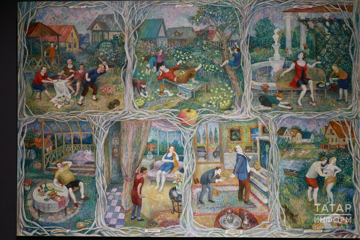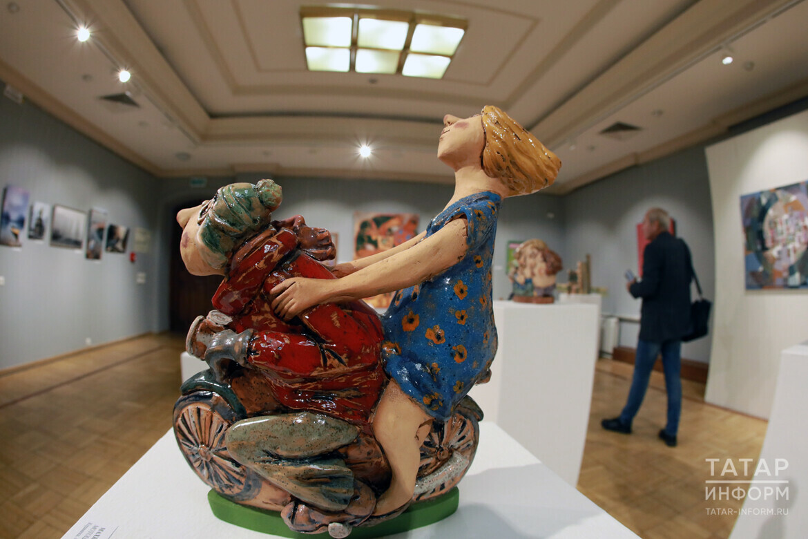 Увидеть здесь можно, например, гобелен «Художник Николай Фешин» из цикла «Над Казанью луна» Анатолия Егорова, за который художник был удостоен премии Тукая, его же «Сны с улицы Баумана» или «Пивной натюрморт» в традициях классической школы Игоря Щетинкина, картину-постер на злобу дня «Колдун несет богатыря» художника-архитектора Александра Лопаткина, а также «Соль грехов» – своеобразное современное «наглядное пособие» человеческих пороков от Марины Самакаевой.