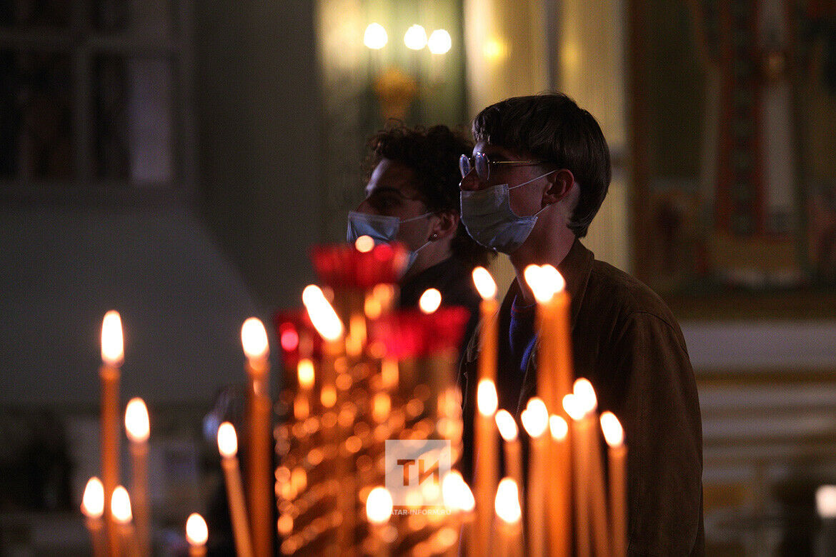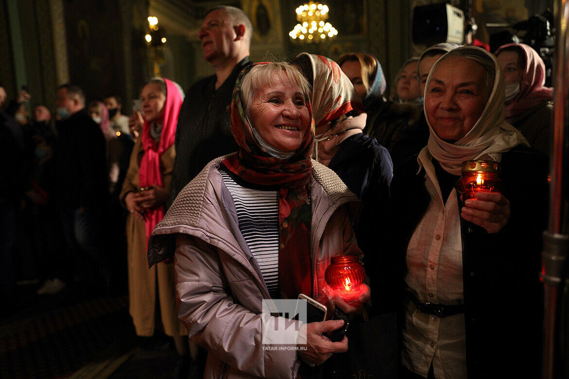 В одиннадцать часов вечера в соборе началась полунощница. На торжественную службу пришло много прихожан. В прошлом году жители Татарстана могли присоединиться к пасхальной службе лишь в формате онлайн из-за антиковидных ограничений, однако в этом году двери храма вновь были открыты для них.