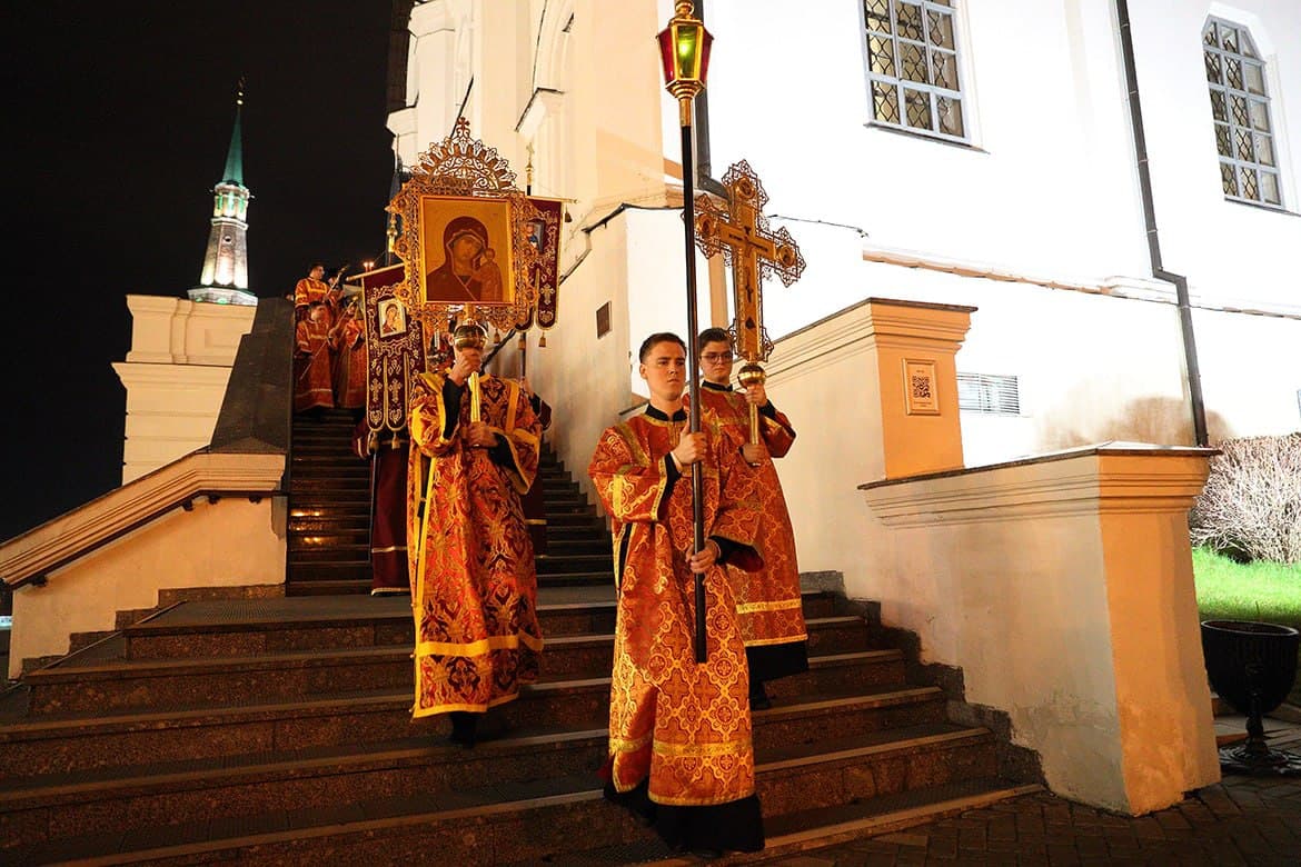 Ближе к полуночи состоялся крестный ход. Прямо перед ним был небольшой перерыв, чтобы люди успели зажечь свечи. После этого священнослужители и прихожане крестным ходом прошли вокруг Благовещенского собора. Под непрерывный звон колоколов они пронесли вокруг храма запрестольные крест и образ Божией Матери.
