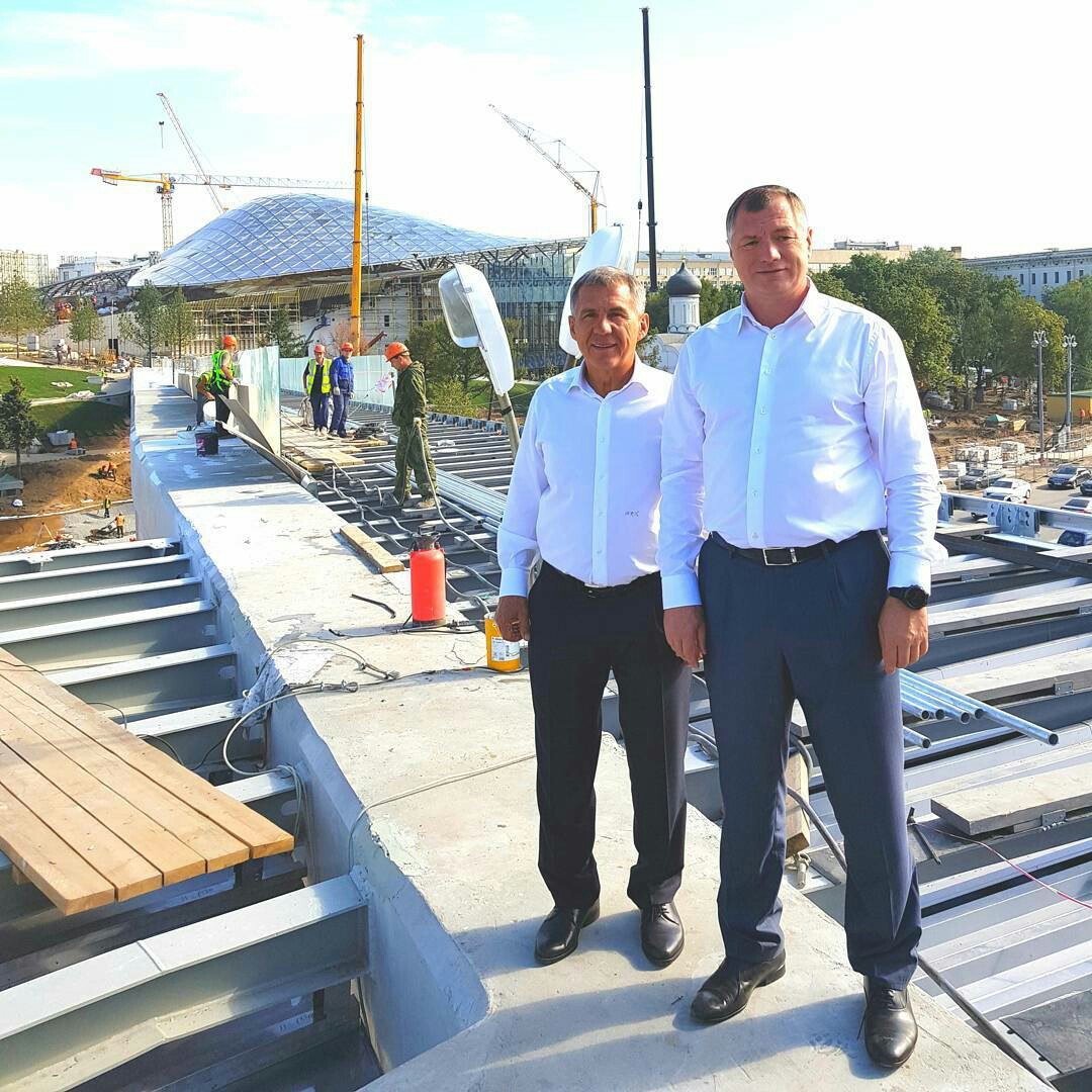 В первой половине дня Марат Хуснуллин продемонстрировал Президенту Татарстана одну из самых грандиозных строек столицы – «Парящий мост», что развернулась в парке «Зарядье», на месте, где раньше располагалась гостиница «Россия».